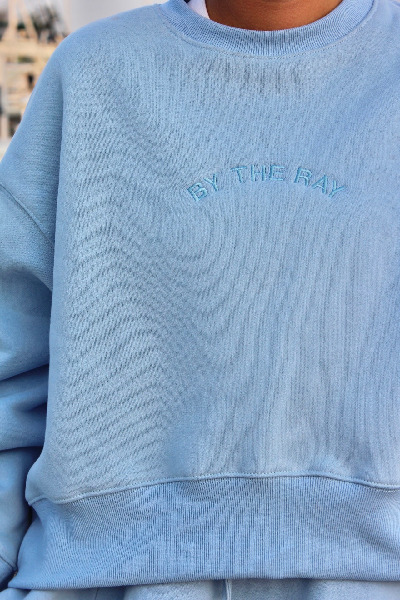 The Barrier Blue Sweatshirt in coastal blue features subtle “By The Ray” embroidery for a clean finish. Designed to pair with the Barrier Blue Skirt.