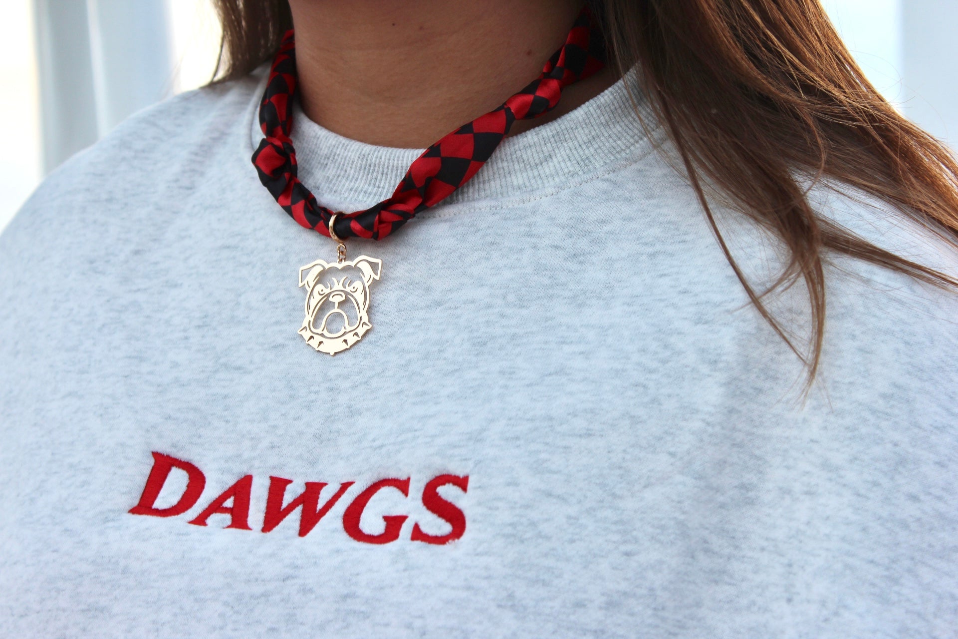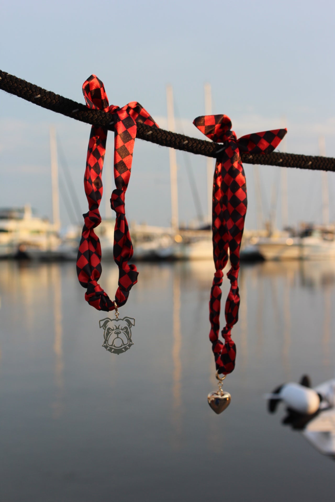 The Red and Black Scarf Necklace features a bulldog charm and comes with matching pearl earrings. Hand-assembled for a unique game day look.