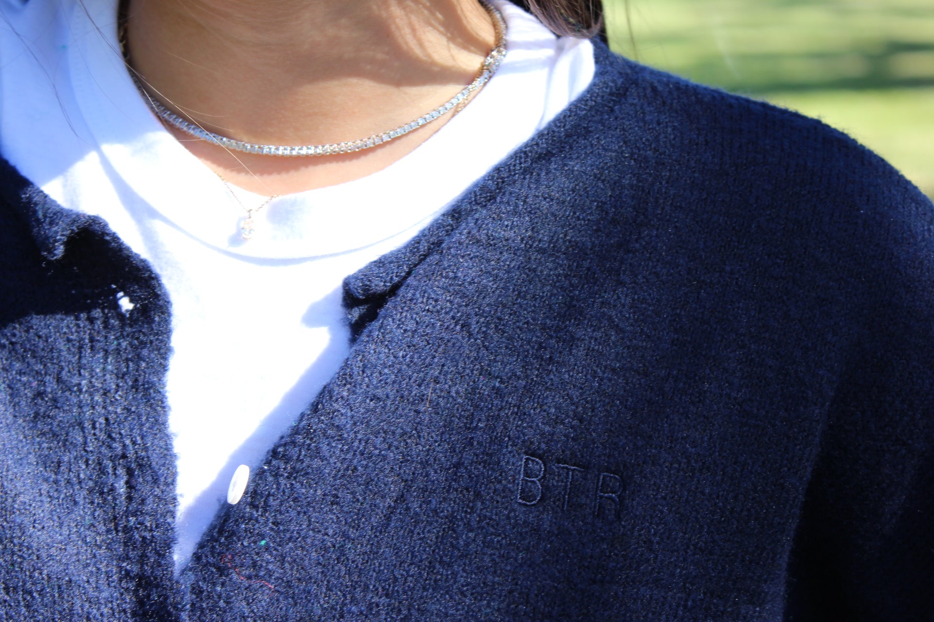 A classic button-down cardigan made for everyday wear. Features a soft, lightweight knit with a relaxed fit, dropped shoulders, and ribbed edges. Easy to style on its own or layered year-round. Small navy embroidery on the left chest.