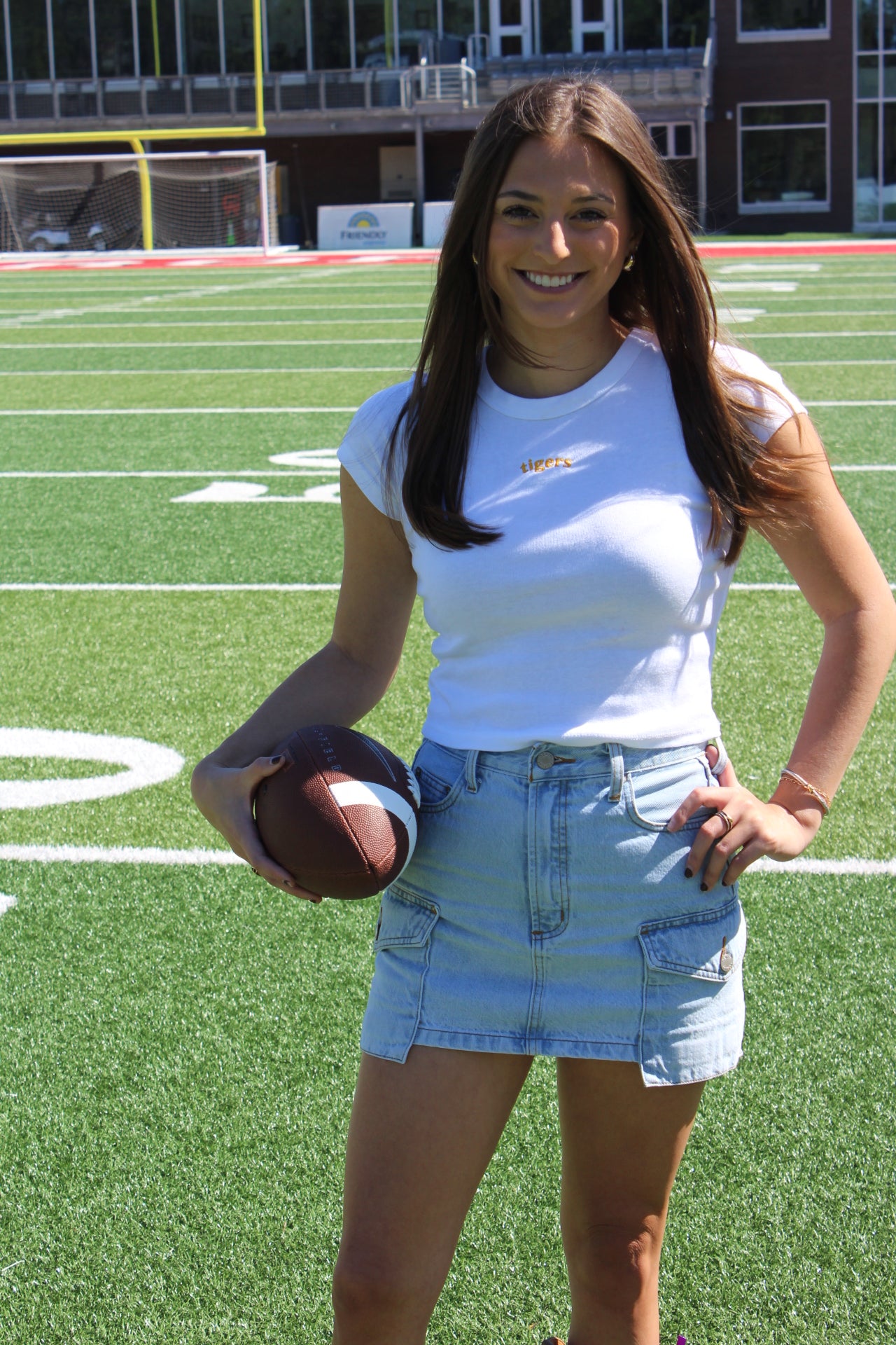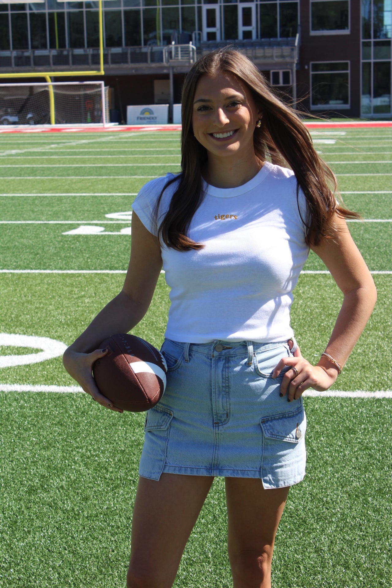 Soft cotton baby tee with a slightly cropped fit, featuring Tigers for LSU, in yellow stitching on the chest.