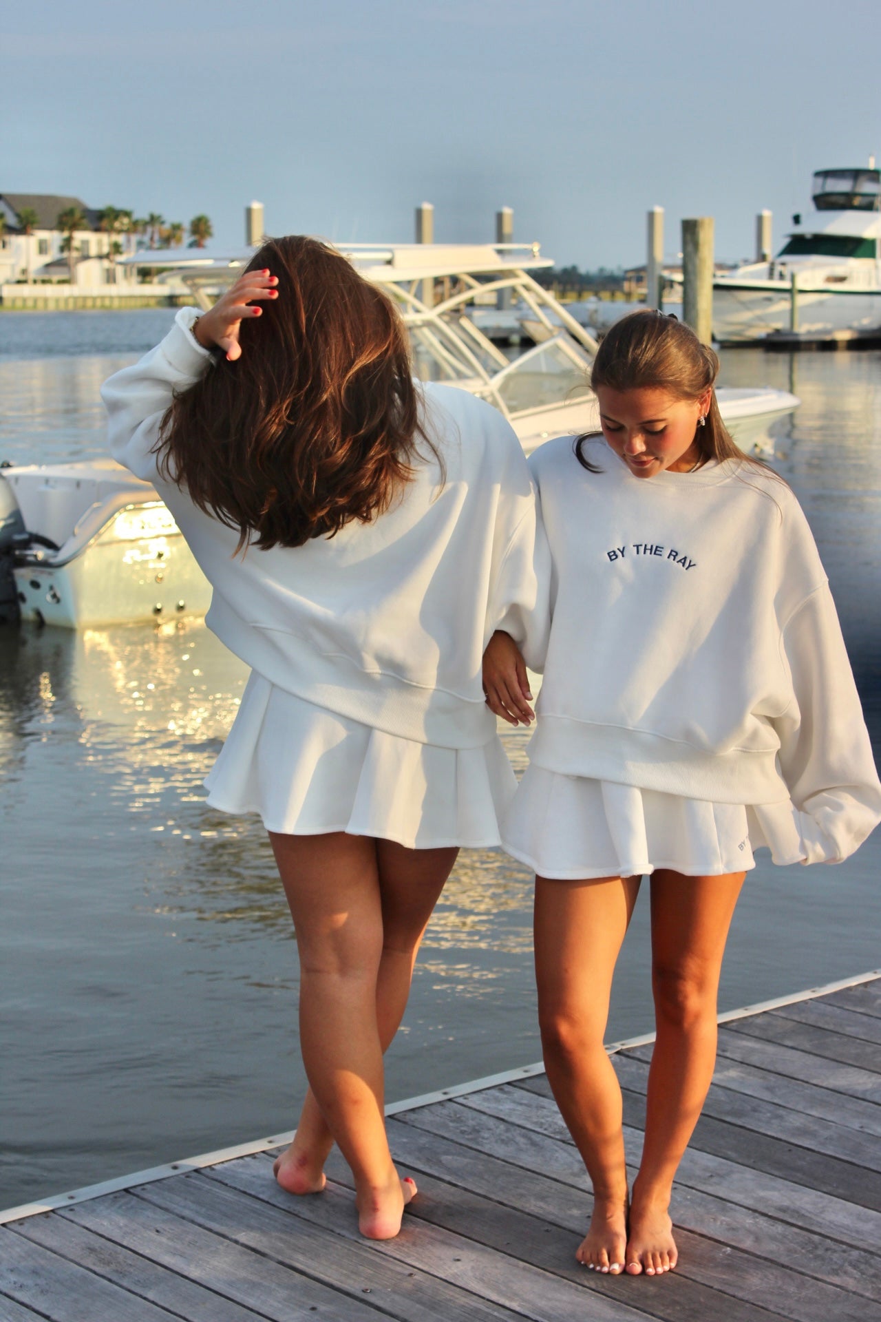 The White Cap Sweatshirt in white features “By The Ray” embroidered in navy across the chest. Designed to pair with the White Cap Skirt.